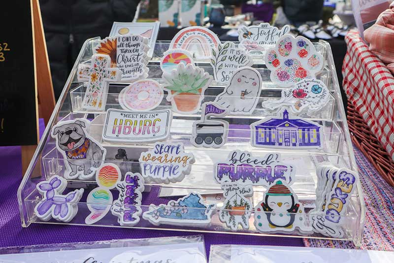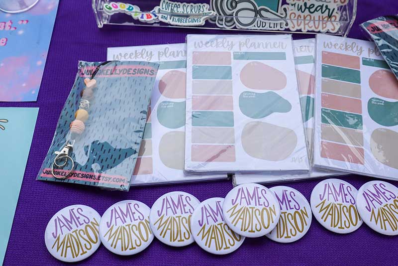 A Turn of Beauty • Ashley’s Little Nook & Bakery • Bad Creek Timber LLC • Baked in Bliss • Black Raven Textiles • Busy Bee Creations • Casady Family Crafts • Couture Custom Crafts • Crabigail’s Crafts • Cuddles & Critters • Cz Creations • Dancing Bears Tea Co. • Designs by Dan • Echos of Mayse • Elsie Tye-Dye • Emilia’s Graces LLC • FancyPance Macrame & More • Fort Blenheim Candle and Clay Works, LLC • Fun With Yarn • Gone Loopy • Green Gables Candling • Happy Valley Crafters • Honeybees’s Bakery • Hopeful Delights, LLC • Hopkin’s Honey • it makes scents • KayKay Rain Boutique • Lazy Beagle 3d Printing • Lilly Bow Chic • M&Ms Crafts and Creatives • Midnight Allycat • Milk & Orchids, LLC • Ocean Breeze Crafts • Off The Hook With Becky • Pappy’s Patchwork • Poplar Spring Botanicals • PrePOPsterous gourmet popcorn • R & B Creatives Woodcrafts & Laser Engraving • Robin’s Rememberies • Roy’s Woodturning • Seed To Sow Jewelry Collection • Sherri Wiseman • Slice of Heaven Baked Desserts • Sparkling Creations Jewelry • Student-Made JMU • Summit+Sea Creations • That Cool Costume Guy • This and That Crochet • Tomlin Family Acres • UpCycle Designs by Carol • Vast Selections